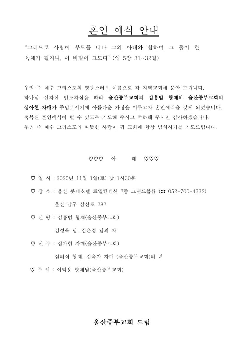 ♡ 주 례 : 이억용 형제님 (울산중부교회)