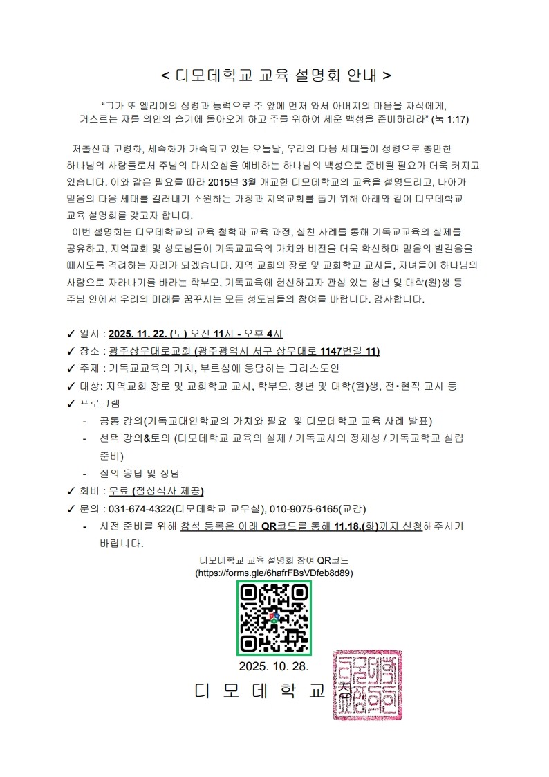 [안내] 디모데학교 교육 설명회 (11월 22일)